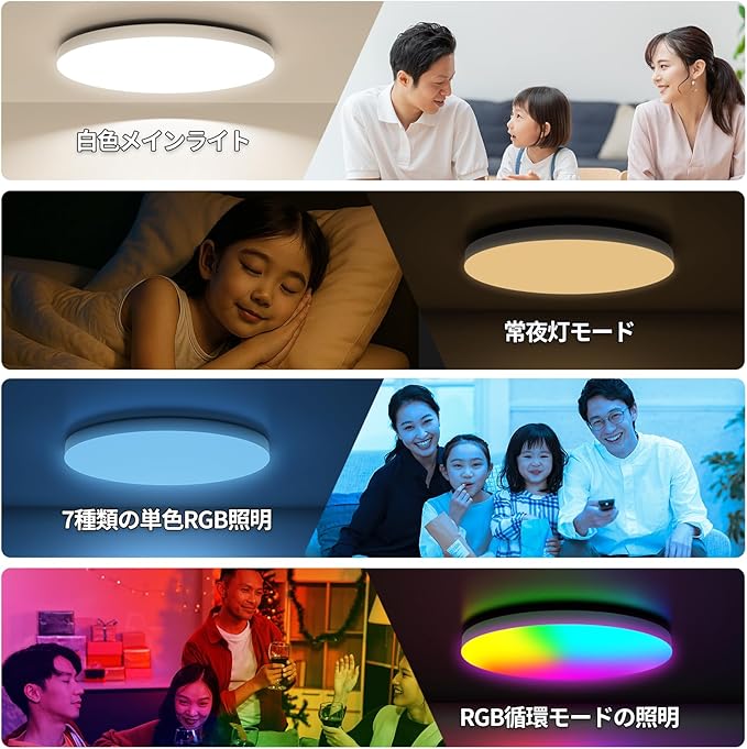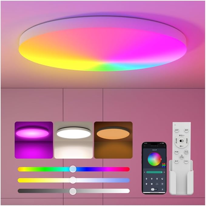 【リモコン付き&調光調色機能】このRGBシーリングライトは、色温度を調整できる機能(3000K ~ 6500K)と多段階調光(10% ~ 100%)をサポートしています。家庭での温かい集まりや効率的な仕事環境、リラックスした読書時間など、様々な場面での照明ニーズに対応します。快適で個性的な照明の雰囲気を作り出し、いつでも心地よく質の高い照明体験を楽しむことができます。