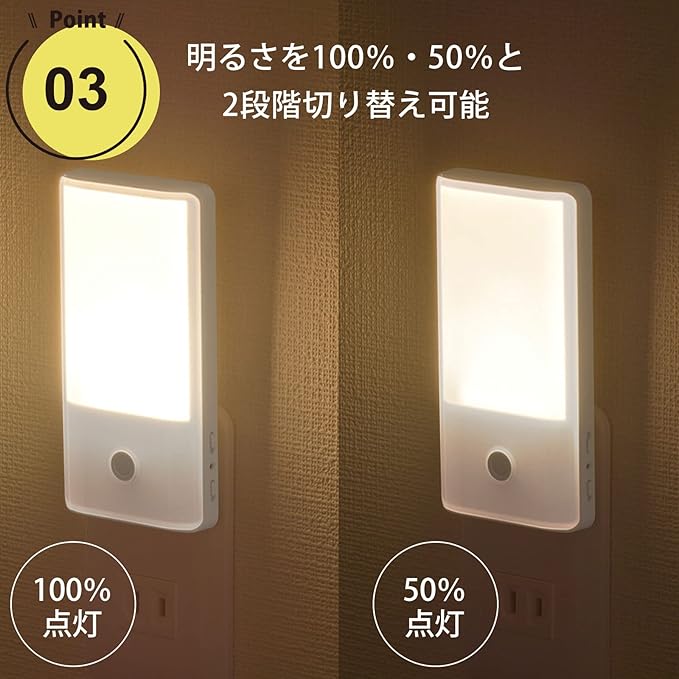 ●周囲が暗くなると自動点灯、明るくなると自動消灯します ●明るさを100%/50%と2段階切り替えできます ●明暗センサーの感度を切り替えできます ●明暗センサーをスイッチでON/OFFできます ●ご家庭の壁コンセントに差し込むだけの簡単設置です ●耐トラッキングPSE新基準(平成27年1月16日改正)準拠 ●LEDを使用しているので長寿命、省電力です ●点灯色は電球色LED