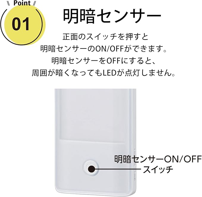 ● 明暗センサーの感度を切り替えできます● 明暗センサーをスイッチでON/OFFできます● ご家庭の壁コンセントに差し込むだけの簡単設置です● 耐トラッキングPSE新基準(平成27年1月16日改正)準拠● LEDを使用しているので長寿命、省電力です● 点灯色は電球色LED