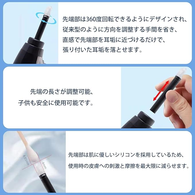 【先端の長さが調整可能】耳の状況は人それぞれなので、先端の長さは調整可能です。外耳道が短い子供への耳かきも安全に使用可能です。また、先端部は肌に優しいシリコンを採用しているため、使用時の皮膚への刺激と摩擦を最大限に減らせます。