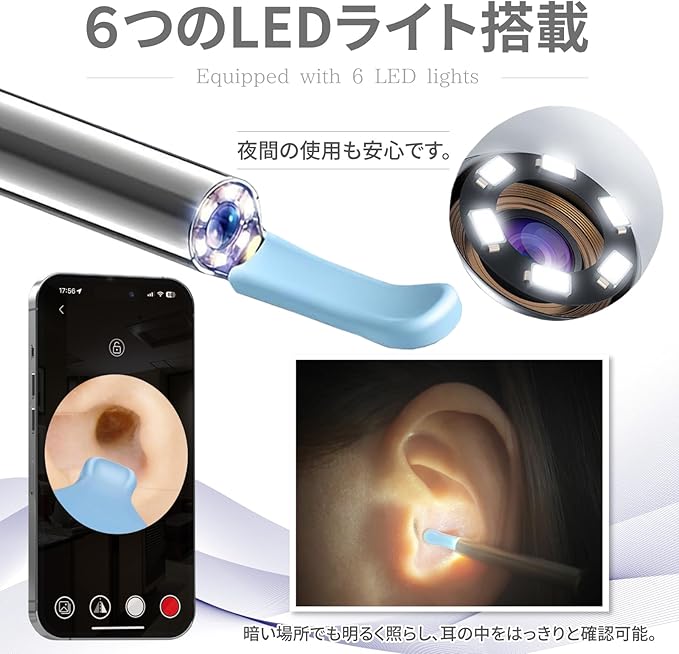 ✅【LEDライト搭載で耳の中がはっきり見える】6つのLEDライトが暗い場所でも明るく照らし、リアルタイムで耳の中をモニタリングできるため、夜間の使用も安心で、鮮明な映像による快適な使用感が得られます。