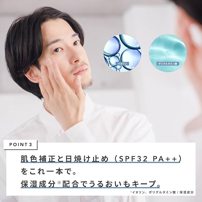 【肌補正から紫外線対策まで、これ1本で。】BBクリームは、日焼け止め・ファンデーション・化粧下地(崩れ防止)・美容成分※が一体になった「オールインワン肌色補正クリーム」です。肌補正をしながら、日焼け止め(SPF32 PA++)で日常的な紫外線から肌を保護します。忙しい朝もこれ1本で第一印象アップに。※テトラヘキシルデカン酸アスコルビル/エモリエント作用、パルミトイルテトラペプチド-7/皮膚コンディショニング作用、ビオチン/皮膚コンディショニング作用