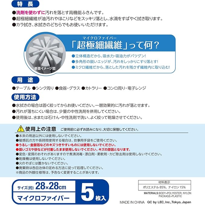 ●洗剤を使わずに汚れを落とす高機能ふきんです。超極細繊維が油汚れやほこりなどをスッキリ落とし、水滴をすばやく拭き取ります