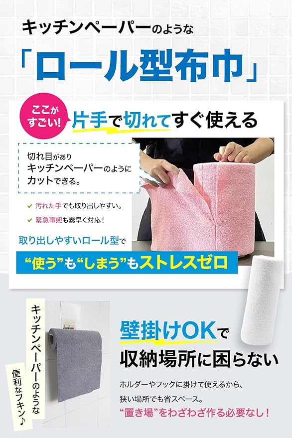 【便利なロール型。使いたい時にサッとカット!】 キッチンペーパーのように、1枚ずつ引き出してカットできるロール型です。必要な分だけ使えるから無駄がなく、収納もスリム。壁掛けホルダーにも対応可能!