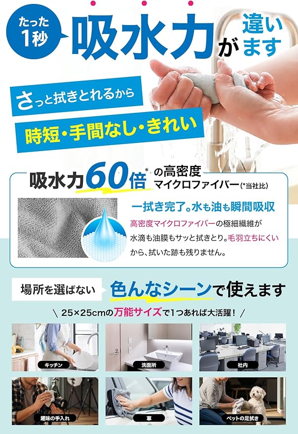 【圧倒的な吸水力で、拭き取りが一瞬!】 従来品より吸水率60倍アップ!高密度マイクロファイバーが、水分・油分・汚れをしっかりキャッチします。一拭きでスッキリ仕上がるから、時短&手間いらず。キッチン・洗面所・車内など、あらゆるシーンでご使用いただけます。