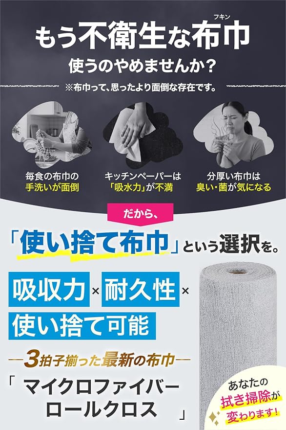 【お掃除のプロ監修】 マイクロファイバークロス 【吸水率60倍アップ】 サッと切り取って使える使い捨てロール型 専門家の使用ガイド付き ZEN-IN (グレー20枚入)
