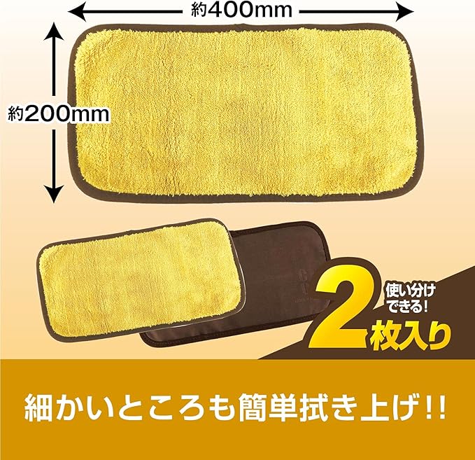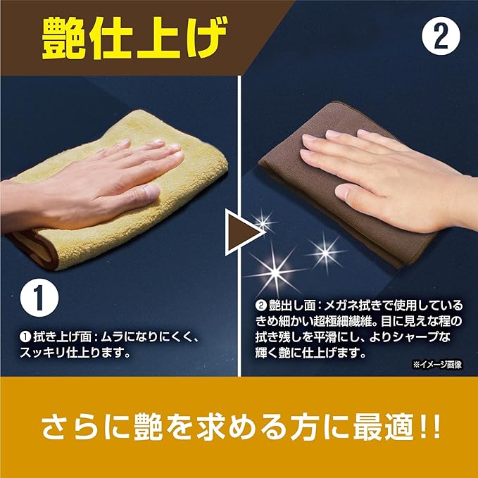 艶出し面は、メガネ拭きで使用しているきめ細かい超極細繊維仕様。目に見えない程の拭き残しを平滑にし、シャープな輝く艶に仕上げます。2枚入りで使い分けできるようになったため、こだわる方や、より手軽に仕上げたい方に最適なクロスです。