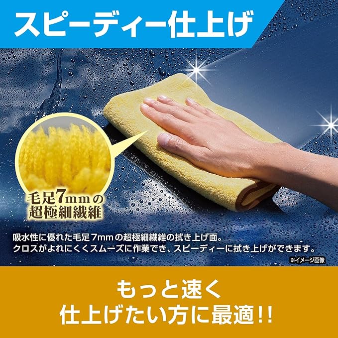 ボディーが濡れた状態・乾いた状態の両方で使用できる毛足の長い拭き上げ面と、艶出し・仕上げに最適な艶出し面の両面2WAYタイプです。吸水性の優れた毛足7mmの拭き上げ面は、クロスがよれにくくスムーズに作業でき、ボディーが濡れた状態でもスピーディーに仕上がります。