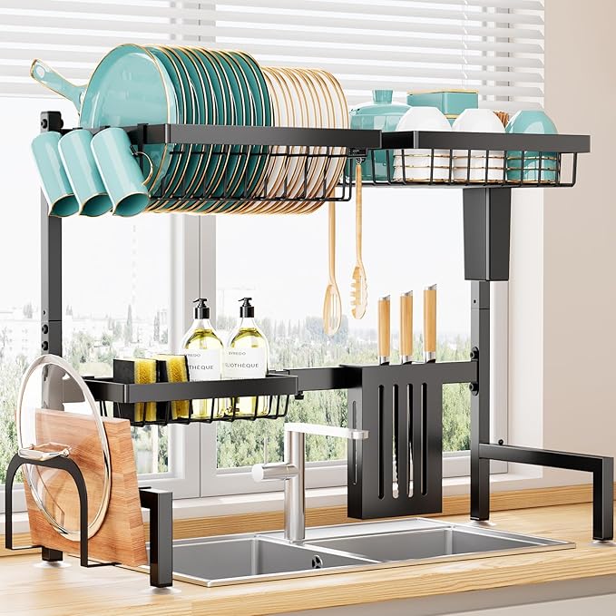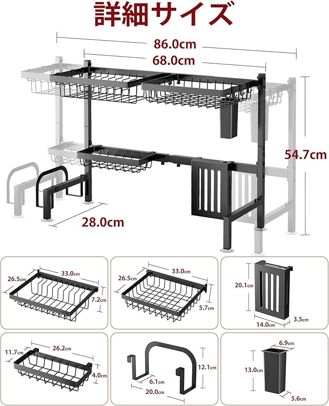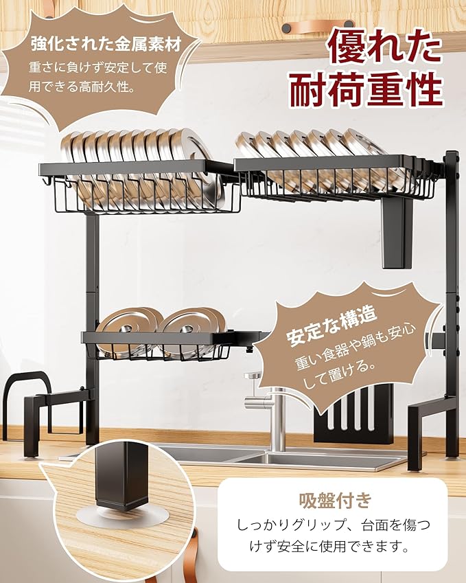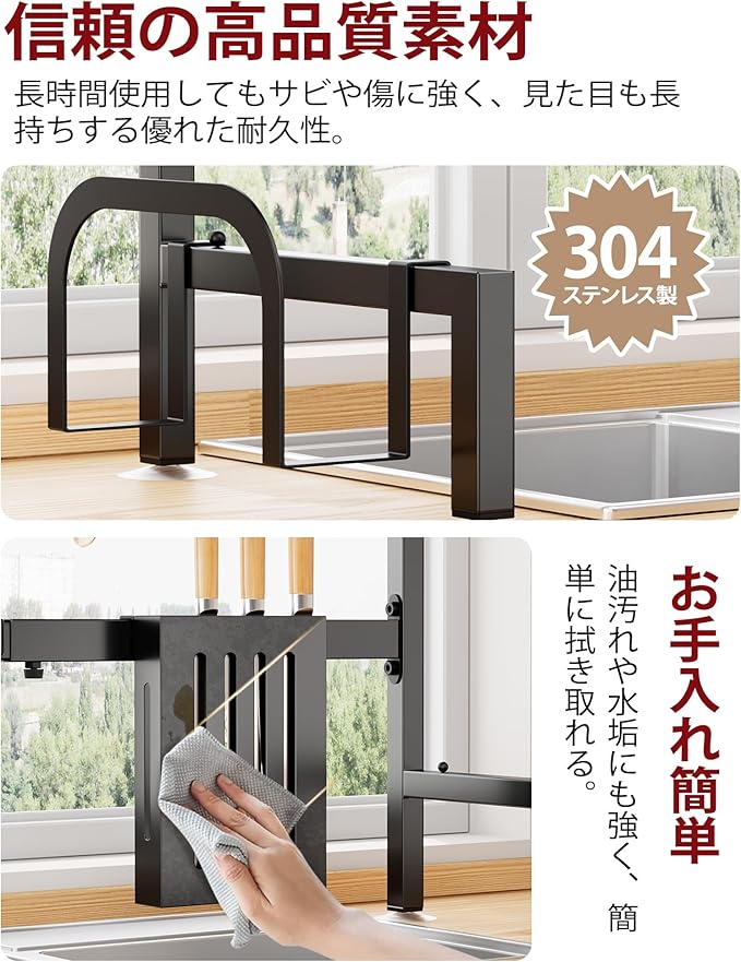 シンク上水切りラック 食器乾燥かご 食器置き場 伸縮式【幅68~86cm】304ステンレス製 錆びない 自動排水 多機能 包丁・まな板スタンド付き キッチン収納 ラック 組み立て簡単(ブラック)
