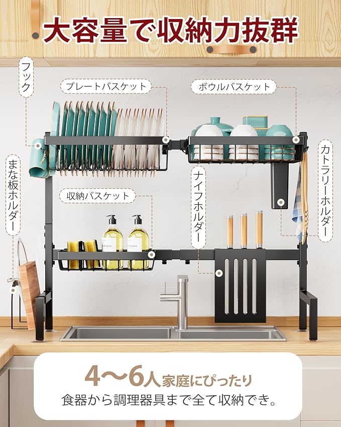 【大容量でキッチンをすっきり整頓】シンク上水切りラックで収納力アップ Sakugiのシンク上水切りラックは、食器、水切りかご、まな板、包丁、洗剤、スポンジなどを一台で収納できる大容量タイプ。キッチンラックとしても大活躍!限られたスペースを無駄なく活用し、カウンターをすっきり整頓できます。
