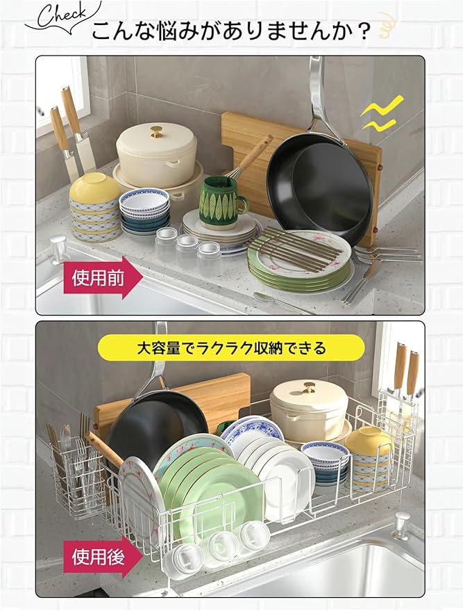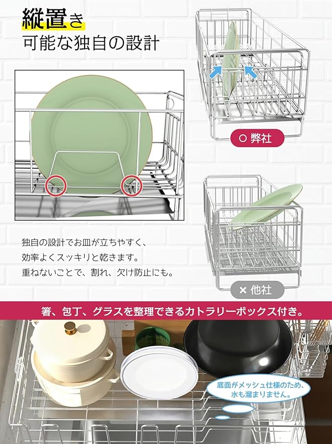 【省スペース】シンク上のわずかな隙間にも設置可能なコンパクト設計。キッチンの調理スペースを圧迫せず、縦置きで洗い物の出し入れがラクラク。水受けトレーには中心へ向かう絶妙な傾斜を施し、水が自然にシンクへ流れる仕組みです。手前のラックはシンクをまたいで水が直接落ちる構造で、水切りかごとしての機能性をさらに強化しました。