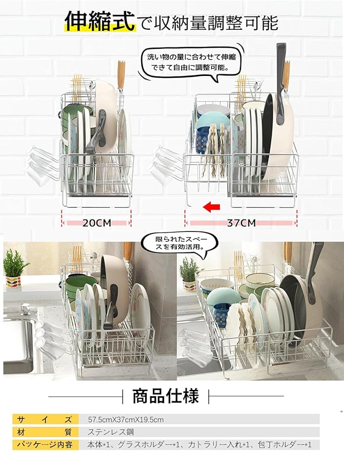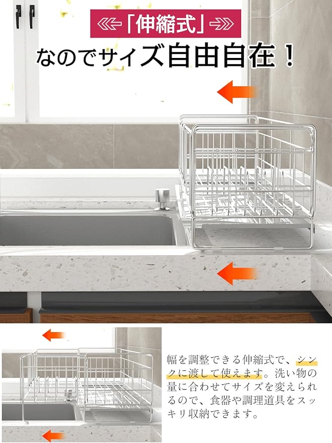 【伸縮式】伸縮機能でスペース活用!洗い物の量に応じて自由に調節可能な設計を採用。スライドすることでサイズを約2倍に拡大でき、限られたキッチンスペースを有効活用できます。