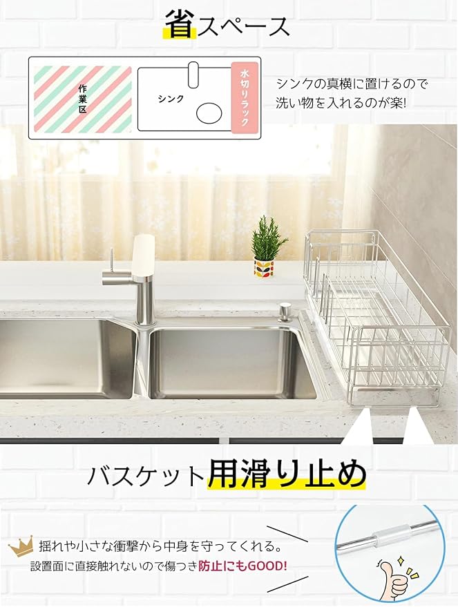 【ステンレス製】水切りラック ステンレスは、錆びに強く、強度と耐久性に優れたステンレス素材を使用しています。汚れが落ちやすく、お手入れが簡単で使い勝手が良いのが特徴です。本体の6箇所に滑り止め仕様が施されており、滑りにくく、キッチンへの傷つきを防ぎます。
