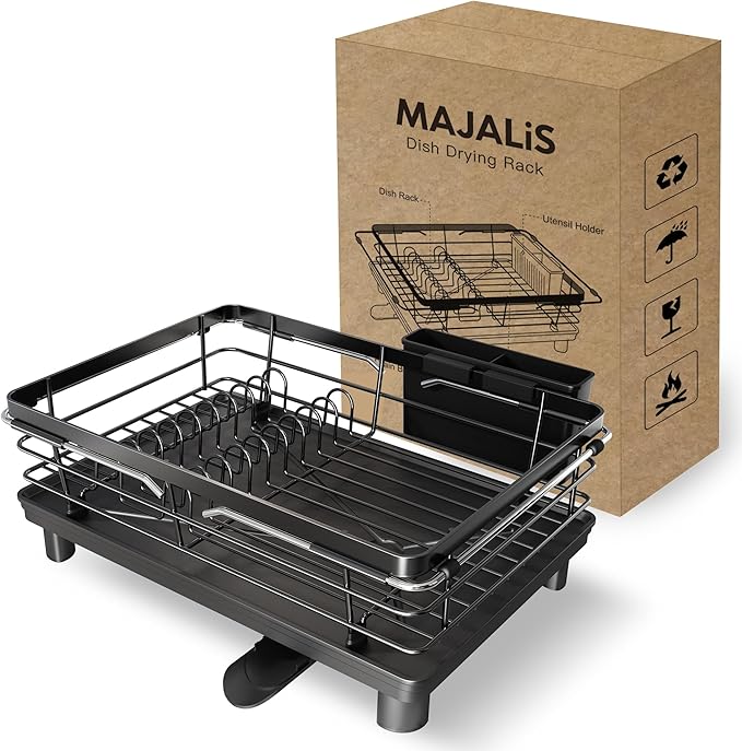 MAJALiS 水切りラック ミズキリラック 食器 ステンレス スリム シンク上 シンク内 伸縮式水切りかご 乾燥ラック 水切りかご 食器乾燥棚 304ステンレス製 自動排水 大容量 錆び防止 高耐荷重 水切りボード付き ブラック