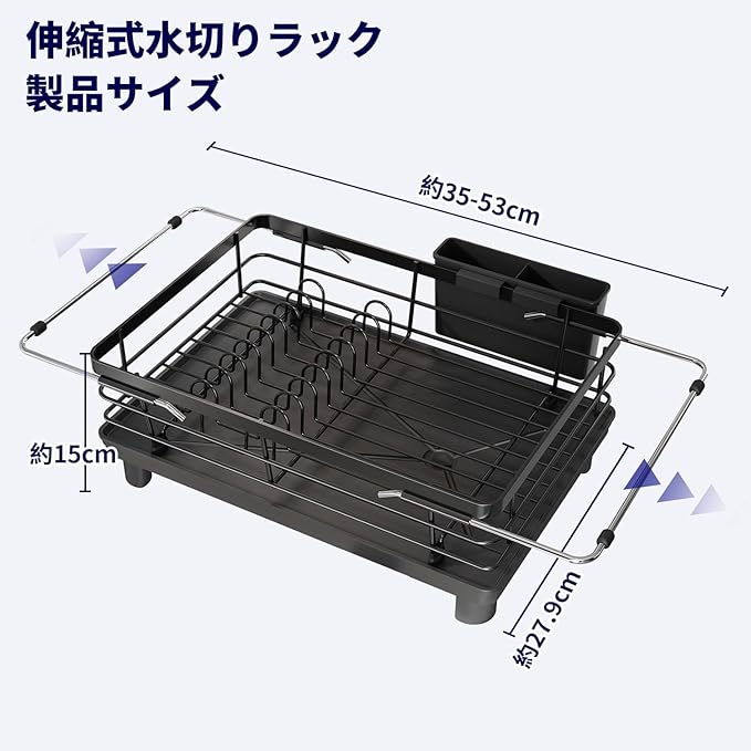 【商品仕様】伸縮式水切りラック / 材質:ステンレス鋼 / サイズ:長さ35.8*幅27.9*高さ15CM 重さ:1kg。本製品に適したシンクサイズ :シンク幅>30CM、38CM<シンクの長さ<49CM。多用途&省スペース水切りラック:この水切りかごは食器ごとにエリアを分けて、プレーラックとボウルラックと食器ホルダーが付き、大容量でキッチンの整理整頓に便利です。