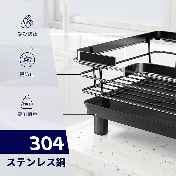 【耐久性に優れている水切りラック】メイン素材は頑丈な304ステンレス製で、錆に強いコーティングが施されています。丈夫で耐久性に優れ、傷もつきにくいです。高品質の防錆加工で長期使用にも十分な耐久性が備えいます。安全性と衛生問題は心配する必要がありません。