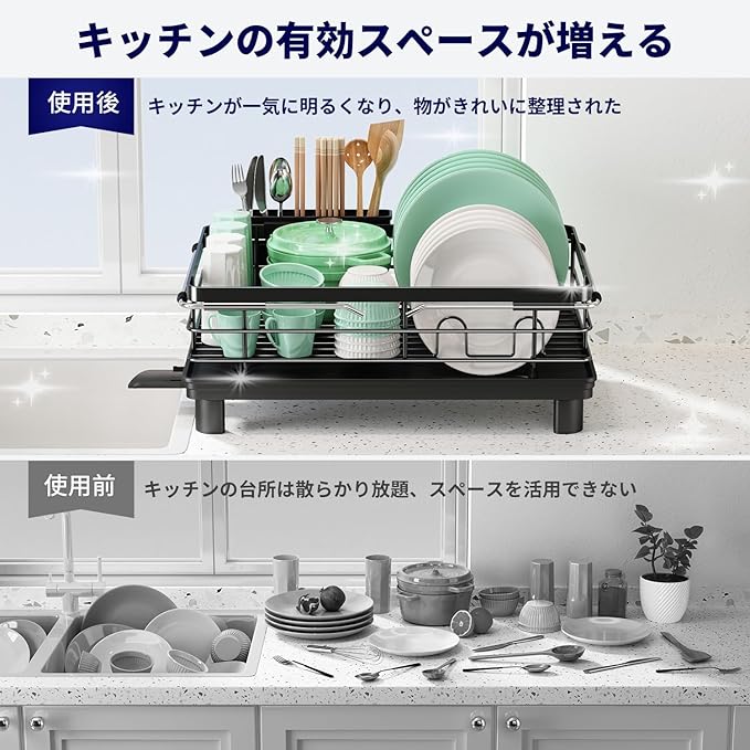 【大容量収納【キッチンの有効スペースが増えてキッチンが一気に明るくなり、物がきれいに整理されます。狭いキッチンスペースを有効に使いたい人にぴったりの食器水切り。一人暮らしまたは2〜3人の小家族にオススメです。