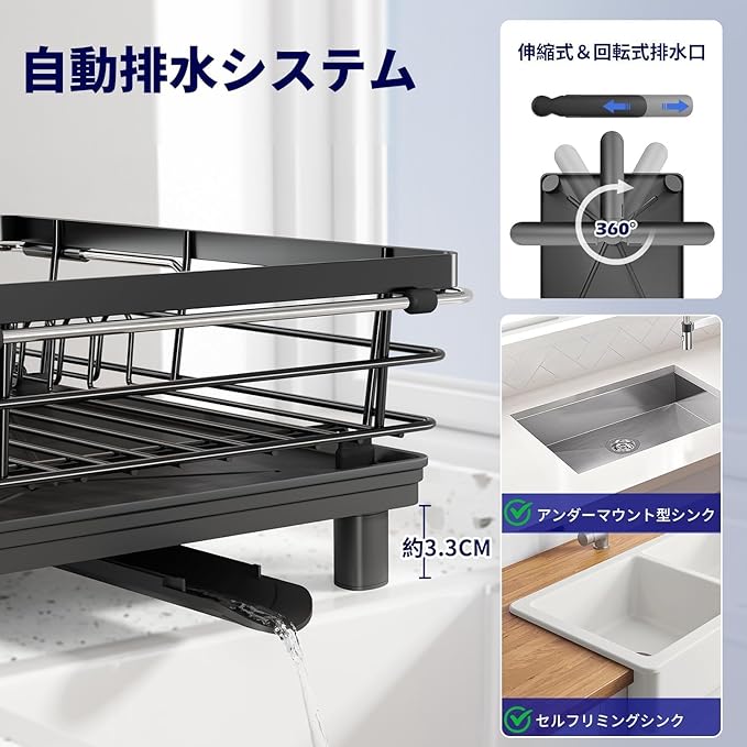 【水切り板付き&自動排水】排水トレーの底は真ん中に排水パイプが接続され、排水パイプは360 回転でき、長さも調整できるので、排水トラブルとサヨナラでき、水が溜まるのを防ぎ、衛生を維持できます。 3方向への自動排水機能があります。