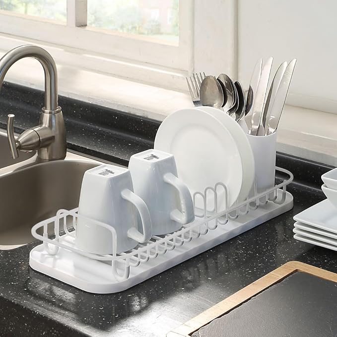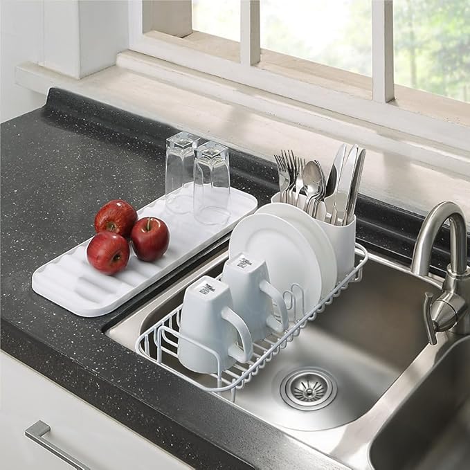 サニーポイント 水切りラック スリム 304ステンレス鋼 箸立て付き 水切りかご シンク上 横立て キッチン 収納 省スペース 水受けトレー 食器乾燥 皿立て (ホワイト)