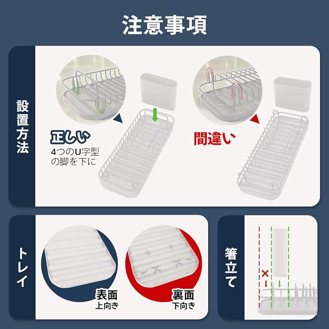 【滑り止め加工】底部の脚に滑り止め加工し、しっかり固定されて動きにくい設計。シンク横やカウンターに直接置いてもズレにくく、カビや水垢の付着を防ぎます。安定性が高いため、食器を安心して乾かすことができます。