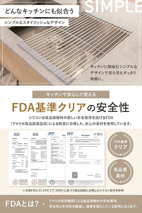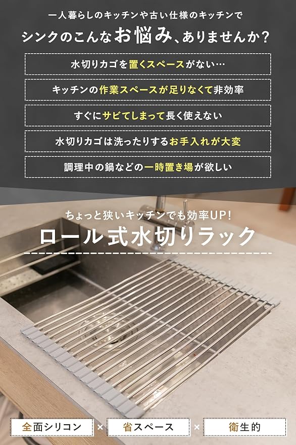 ✅【丸めて収納できるロール式で省スペース】 使用しないときはクルッと巻いて収納できるロールタイプの水切りラック。シンクの上に広げて使えるので、調理スペースの確保や水切りに便利です。使い終わったら丸めて引き出しや隙間にすっきり収納可能。キッチンを広く清潔に保ちたい方に最適な省スペース設計の水切りラックです。