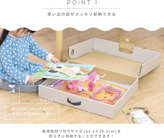 画用紙四つ切りサイズが折れずに入るので安心。他にも習字の作品や大切な賞状を入れたりベビー服など思い出の洋服を入れたりできます。
