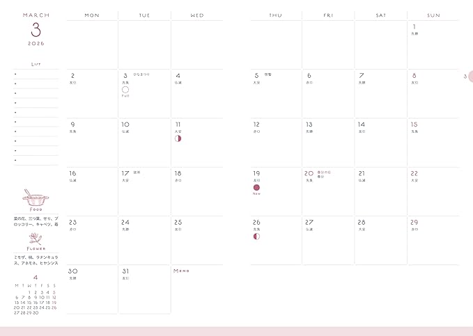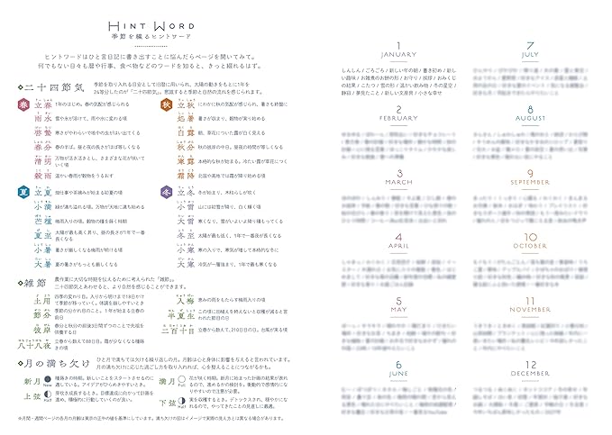 日本の美しい季節の移ろいを表す「二十四節気・六曜・月の満ち欠け」を掲載。
