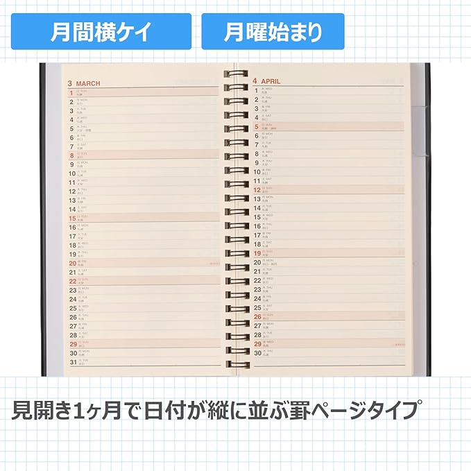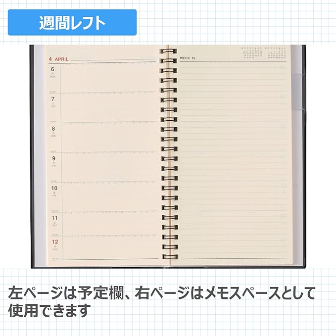 【商品説明】平らに開いて書きやすいNOLTY(ノルティ)のリング式ウィークリー手帳【月間ページ】見開き2ヶ月で日付が縦に並ぶ罫ページタイプのレイアウト。長期の予定やプロジェクト管理に便利です。【週間ページ】見開き1週間のレフトタイプ(月曜始まり)。予定とメモにバランスの良い手帳です。