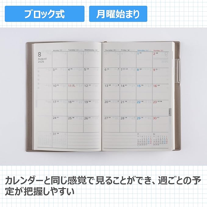 【月間予定欄:ブロックタイプ】使いやすいブロック式。欄を上下に区切ってあるので、午前と午後の予定を記入するのにも便利。 <BR>【デイリーページ:5ミリ方眼】デイリーページには毎日の出来事をたくさん記録できます。優しいブルーグリッドを採用していて、文章だけではなく図やイラストを描くのにも便利です。