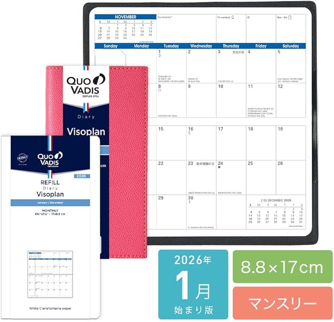 「クオバディスの 2026 年版手帳。フランス生まれの手帳限定商品が贈る、使う人の時間管理を追求したダイアリーです」