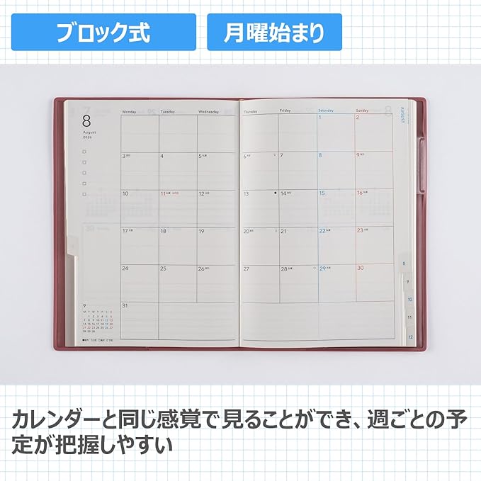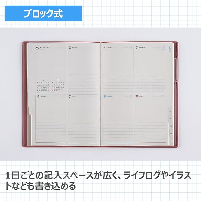 【月間予定欄:ブロックタイプ】使いやすいブロック式はインデックス付きで便利。 5週6週併用型なので、どの月もめいっぱい書き込むことが出来ます。 <BR>【週間予定欄:ブロック式】週間ブロック式は1日ごとの記入スペースが広い点が特徴。 ライフログやイラストを書き込めるほか、ビジネスユースとしても使え、思いのままに記入が出来ます。