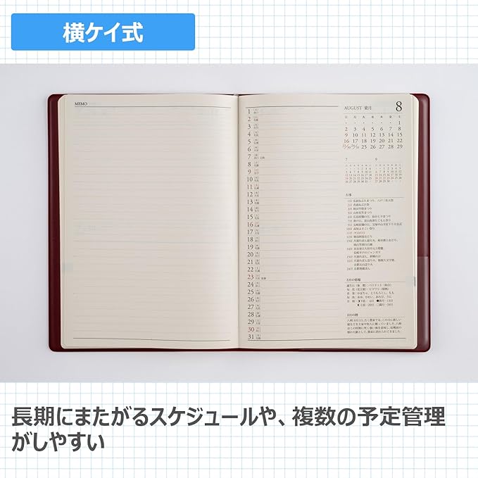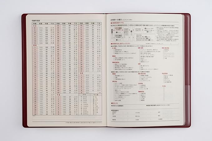 【商品詳細2】表紙タイプ:皮革調 ●刷色:2色刷 ●ページ数:256頁 ●スペック:歳時記入り,旧暦入り ●付録:年齢早見表,印紙税額一覧表,非常時への備え ●別冊:,横ケイメモ,方眼メモ,切り取りメモ