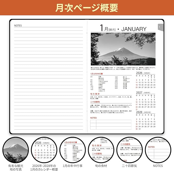 【書きやすいページ】2026年手帳の1日1ページはノート型です。各日付には、年月日、曜日のほかに、六曜と月の相が書かれています。月間ページは横軸レイアウトです。2026年から2028年の同じ月を比べることができます。