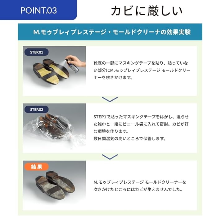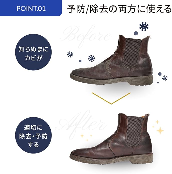 人気商品【モールドクリーナー】に使い捨てのウェットシートタイプが登場です。●用途:スムースレザー(表革)の靴、パンプス、ブーツ、スニーカー、サンダル、バッグ、ベルト、財布、手帳等 ●使用法:・シートを一枚ずつ取り出してご使用下さい。・モールドクリーナーシートで皮革製品の表面を軽く拭いてください。・靴の中も軽く拭くのおがオススメです。・まだカビが残っているようでしたら数回、新しいモールドクリーナーシートを一枚取り出して表面を拭く作業を繰り返してください。・5~7日間風通しのいい日陰で保管してください。カビが多い場合はモールドクリーナーシートで拭いた後で別売りの【M.モゥブレィ プレステージ モールドクリーナー】をご使用頂くとより効果的です。・使用後は必ず手を水で良く洗ってください。●注意:※スエード、ヌバック等の起毛皮革製品やヌメ革及び爬虫類革には使用できません。※モールドクリーナーシートを使用しても皮革製品の保管場所の湿気や温度等の環境によってはカビが再発する可能性があります。※シミや色落ちする比較もございますので予め目立たないところでテストしてからご使用ください。※子供の手の届かない場所に保管してください。※使用後は乾燥を防ぐためフラップをしっかりと閉じてください。※水には溶けませんのでトイレには流さないでください。※万が一使用後に皮膚に異常を感じた場合は水で良く洗い流した後、専門医に相談してください。