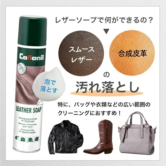 【初めての革製品ケアにもオススメ】フォーム状のクリーナーは、靴だけでなくばバッグなどの面積が大きいサイズのアイテムも簡単にケアできます。水分が少なく、塗ってもシミになりにくいため、初めて革製品をお手入れする方にもオススメです。合成皮革の製品にもご使用いただけます。※起毛皮革製品(スウェード、ヌバック、ベロア)にはご使用いただけません。