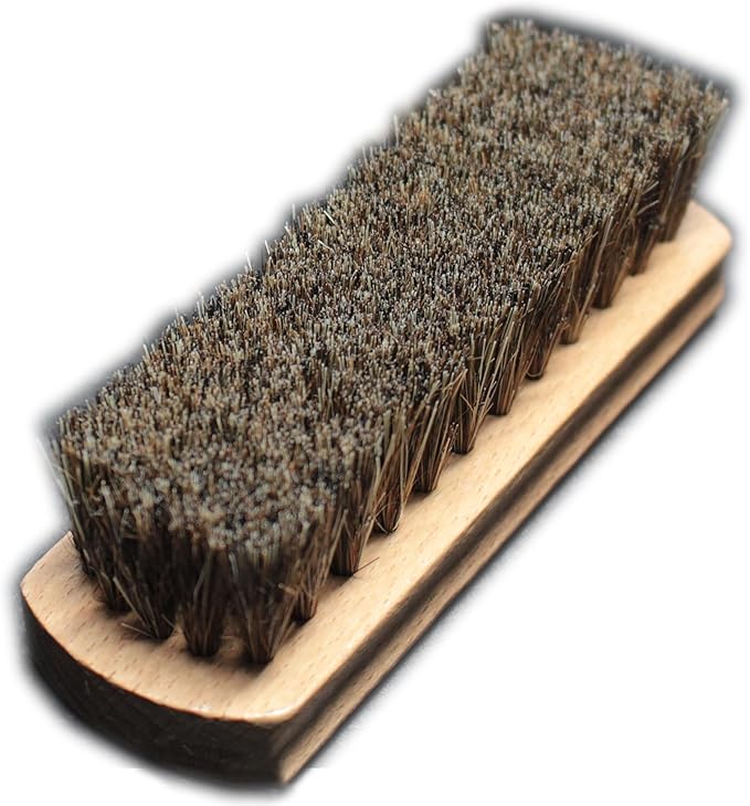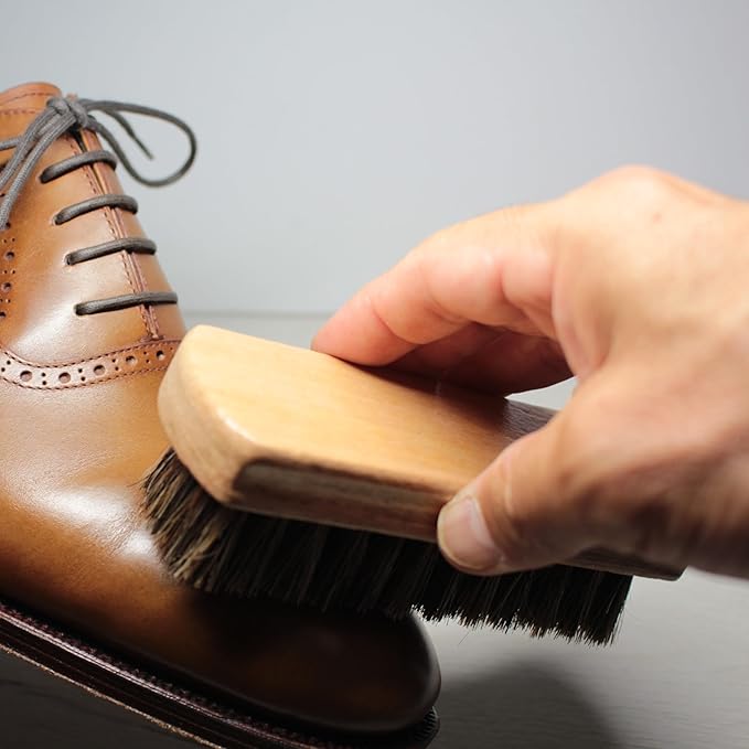 布 や スポンジ でクリームを添付した後の仕上げに 靴クリームを塗った後、 ブラッシングすると 靴になじみ、伸ばすことにより光沢もでます。馬毛は革靴に馴染みしっかりと靴に光沢感を与えます。