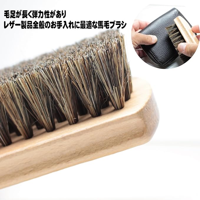 サイズ:長さ133mm*幅43mm*厚さ:40mm(毛足長さ:約25mm)、 毛の種類:天然馬毛 100%、 用途:革製品のクリーム添付、ホコリ落としに。スムースレザー(一般的な表革)の靴、パンプス、ブーツ、