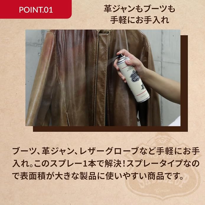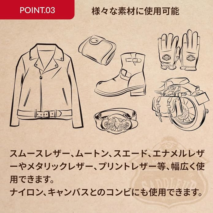 使用できるもの:ライディングブーツ、ワークブーツ、アウトドアシューズ、トレッキングシューズ、レザーグローブ、レザージャケット、レザーパンツ、レザーウォレット等の一般的な革製品(表革、起毛革)