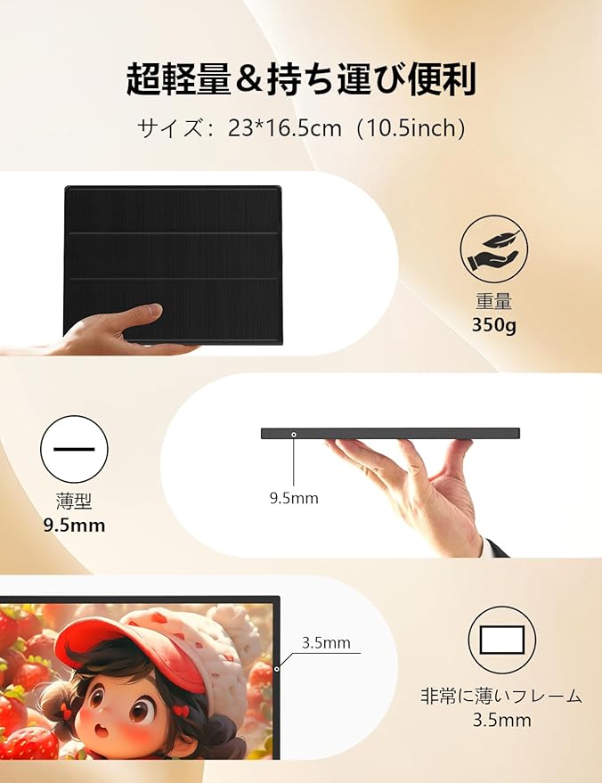 【高精細10.5インチフルHD小型モニター】本製品は1920 1080のフルHD解像度と高品質IPSパネルを採用し、鮮やかでリアルな映像を実現。178度の広視野角により、どの角度からでもクリアな画面表示を楽しめます。100% sRGBの広色域対応で、写真編集や動画鑑賞、ビジネス用途まで多彩なシーンで活躍。ブルーライト軽減機能も搭載し、長時間の使用でも目に優しい設計です。