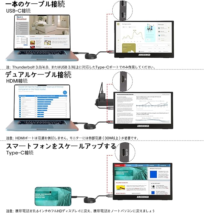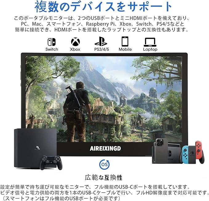 【多彩な接続方法・簡単設定】AIREIXINGDモバイルディスプレイは豊富な入力端子を備えており、ノートパソコン、デスクトップ、スマートフォン、Switch、PS4、PS5、Xboxなどの機器に対応しています。(注意:①音量ボタンやメニューボタンが操作できない場合は、再起動をお試しください。ディスプレイには内蔵バッテリーがないため、Switch接続時はSwitch純正の電源アダプターでディスプレイに電源を供給してください。)さらに、製品の電源にも注意が必要で、アダプターの出力は15W以上であることを推奨します。