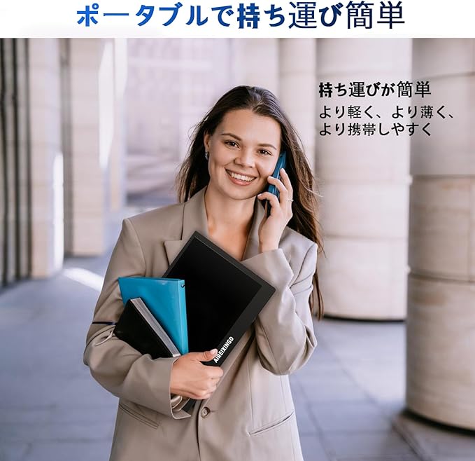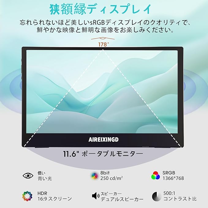 【11.6インチHDディスプレイと160 の視野角】解像度は1366 768のHDで、TNノングレア液晶パネルを採用し、光の反射を抑えて目の疲れを軽減します。ポータブルディスプレイは160 の視野角を備えています。11.6インチ60Hzのモバイルディスプレイはスリムベゼルデザインで持ち運びに便利で、屋外や作業中の理想的なサブディスプレイです。