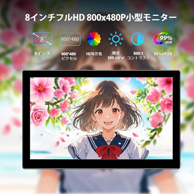 ミニ モニター 8 インチ HD 800x480 LCD ディスプレイ、ラップトップ PC スイッチ Ras Pi 用 HDMI 小型モニター、スピーカーとスタンド内蔵