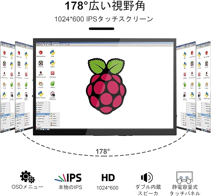 7インチモニター IPS 1024 x 600 LCD タッチスクリーンミニディスプレイ PCサブモニター デュアルスピーカ ス ピーカ内蔵 変換コネクター付属