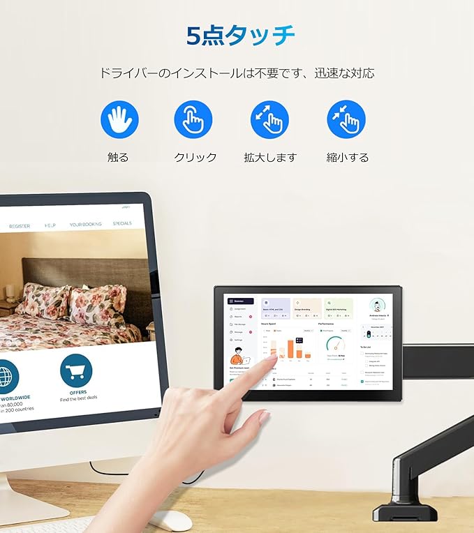 【プラグアンドプレイ】プログラムをインストールする必要がなく、HDMIケーブルで直接接続して使用できます。拡張モード、コピーモード、セカンドスクリーン表示モードの3つの出力モードをサポートしており、それぞれのモードで異なる体験を提供します。仕事の利便性と効率性。タッチ機能を使用するには、追加の USB ケーブルを接続する必要があります (USB 信号伝送をサポート) 画面は 5 点タッチをサポートし、感度が良く、スライド、スクロール、選択、ズームイン、ズームアウトが可能で、反応が速くなります。 7インチのタッチスクリーンは消費電力が少ないため、大電力による停電の心配がありません。