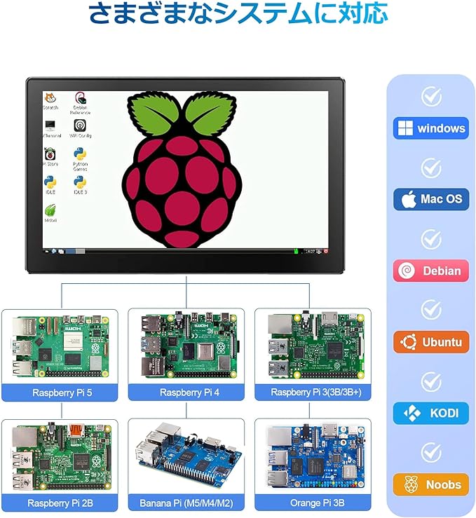 さまざまなデバイスやiOSと幅広く互換性があります:Raspberry Pi愛好家向けに設計された当社の7インチモニターは、Raspberry Pi(PI5 / PI4 / PI3B + / PI3 / PI2 / ZERO)を含むすべてのRaspberry Piバージョンに適合します。Octo Pi、BB Black、Banana Pi、Retro Pi、ゲームコンソール(XBOX / PS4 / PS5)、コンピューター、TVボックスなどと互換性があります。この小型モニターは、Windows、Raspbian、Noobs、Kali-linux、Debian、Ubuntu、Kodiとシームレスに動作しますが、タッチ機能はIOSシステムでは無効になっていることにご注意ください
