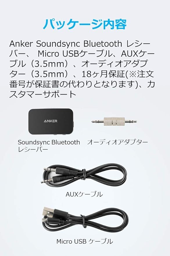 パッケージ内容:Anker Soundsync Bluetoothレシーバー、Micro USBケーブル、AUXケーブル (3.5mm)、オーディオアダプター (3.5mm)、取扱説明書、カスタマーサポート