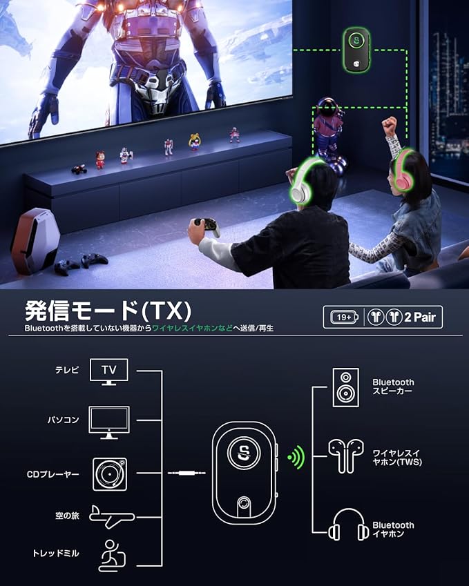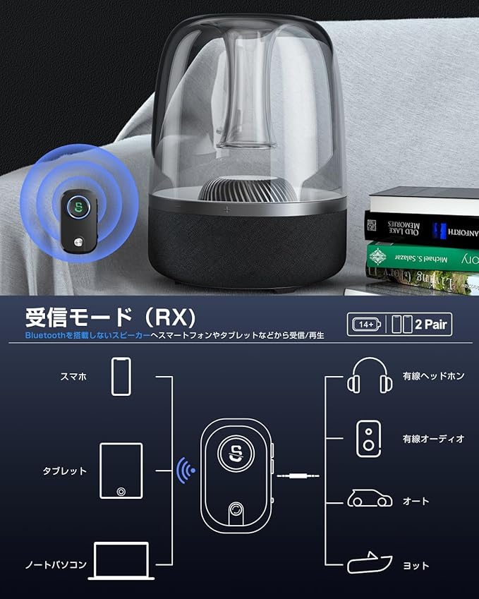 【Bluetooth非対応の機器をBluetooth対応に】送信モード・受信モードの2つのモードに対応しており、Bluetoothを搭載していない機器からワイヤレスイヤホンなどへ送信/再生、Bluetoothを搭載しないスピーカーへスマートフォンやタブレットなどから受信/再生と1台2役でお使い頂けます。