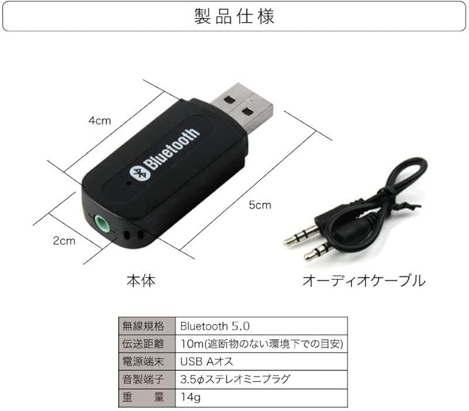 5、【適合規格】:Bluetooth Ver5.0 + EDR 対応プロファイル:A2DP V1.2 有効距離:10m 付属品:3.5mmオーディオケーブル
