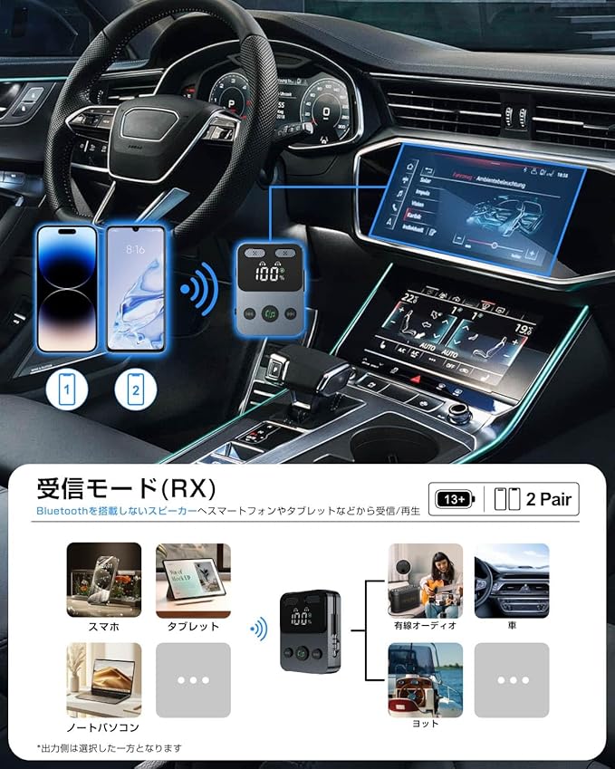 【受信機(レシーバー)モード】2台のスマートフォンやタブレットなどに接続可能、フル充電後、最大13時間連続使用可能てす。(*注意:2台目のスマホの音楽を再生したい場合は、現在のスマホの音楽を一時停止してから、再度クリックして2台目のスマホの音楽を再生してください。)