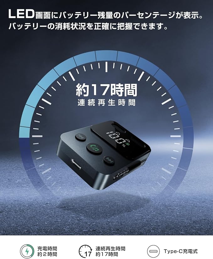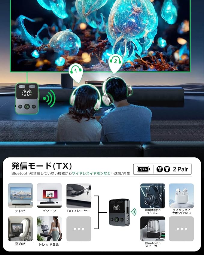 【送信機(トランスミッター)モード】2台のワイヤレスイヤホンなどに同時再生可能、フル充電後、最大17時間連続使用可能で、長時間のフライトにも十分対応できます。